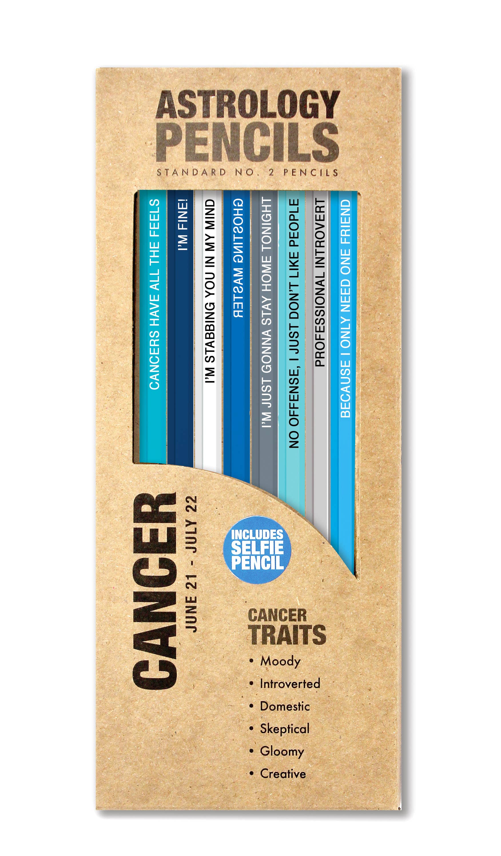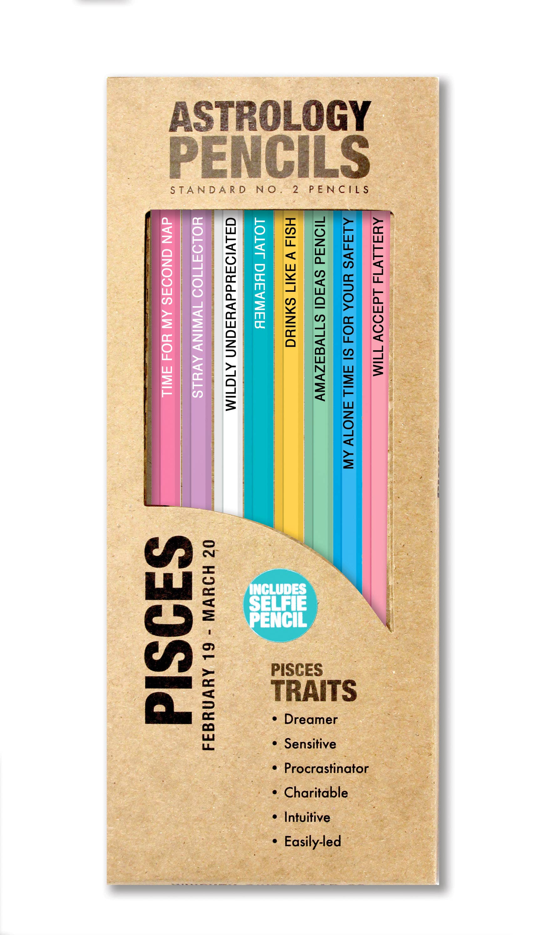 8 custom pencils made specifically for each sign. Each set features a "selfie pencil" with backwards writing to fulfill all your selfie needs...we see you, Leo.