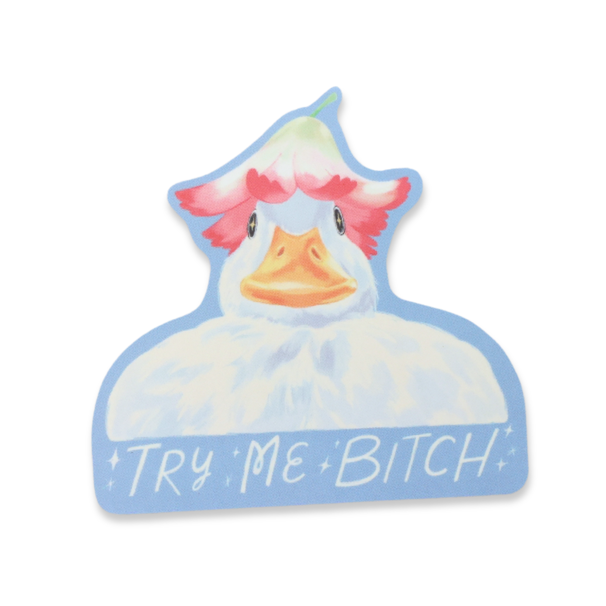 Show off your fierce side with this sassy "Try Me Bitch Duck" vinyl sticker. Perfect for anyone who’s ready to take on the world with a cheeky attitude and a splash of humor. Stick it on your laptop, water bottle, or anywhere you want to warn the world you’re not to be messed with—duck style! Durable, bold, and unapologetically funny.